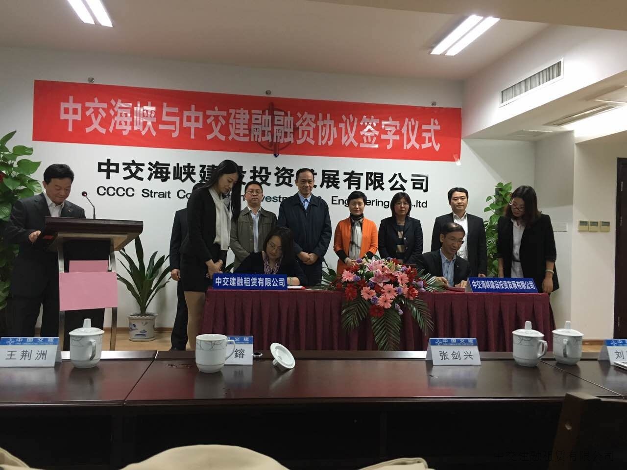 2015年11月12日,中交租赁、中交海峡融资服务协议签约仪式在福州举行。中交建融租赁有限公司董事长、党委书记张剑兴,中交总承包公司党委书记刘萍芳出席签约仪式并分别发表致辞。中交租赁副总经理钱鎔、中交海峡总经理谭发茂签署融资服务协议。中交租赁保理业务部总经理王荆洲、中交总承包总会计师张丽、中交海峡副总经理蒋立、福州地铁二号线项目总经理部总经理盛治水等各位领导参加签约仪式。